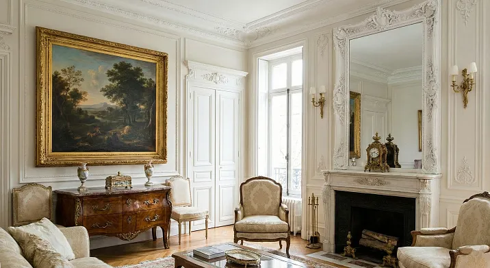 Гостиная. Зеркало декоративное (отражает свет, визуально расширяет пространство, создаёт иллюзию окна), размер шестьдесят на сто пятьдесят или более (крупное, доминантное). Рама массивная (выпуклый багет шириной восемь-пятнадцать сантиметров, орнаментированный), цвет контрастирует со стеной (стена тёмная — рама золотая, светлая — рама тёмная).