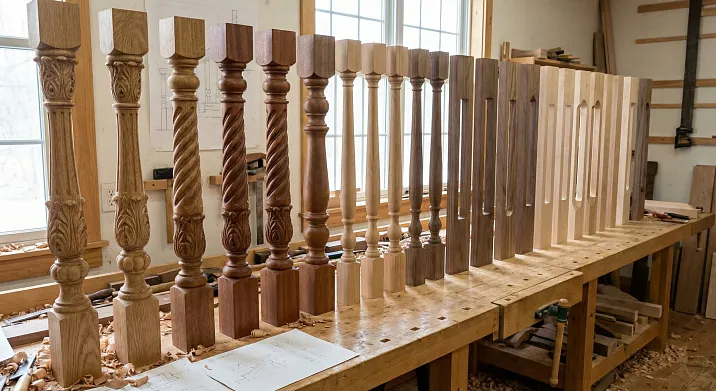 Балясины и столбы для лестниц работают в связке. Столбы (опорные балясины, newel posts) — массивные вертикальные элементы сечением 80×80, 100×100, 120×120 миллиметров, устанавливаемые в ключевых точках: начало лестницы, конец, повороты.