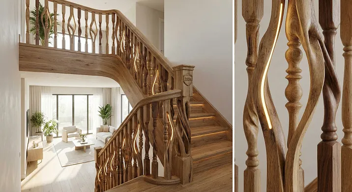 Балясины для лестницы из дерева не существуют отдельно — они работают в системе с поручнем (перилами), опорными столбами, подбалясенником. Лучшие проекты 2026 года демонстрируют, как эти элементы объединяются в целостную композицию.