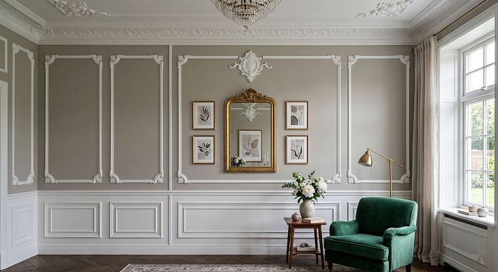 В современном интерьере этот принцип переосмыслен радикально. Никакой деревянной обшивки всей стены. Никаких тяжёлых конструкций. Эффект буазери создаётся иначе: на окрашенную или оштукатуренную стену монтируются молдинги для буазери из полиуретана, которые формируют рамки, пояса, вертикали и горизонтали. Вся система красится в единый цвет — и стена обретает нужный характер.