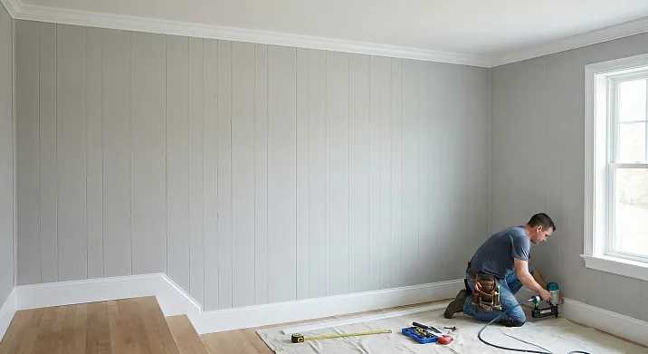Обычно 1–2 дня на монтаж панелей плюс 1 день на установку молдингов, карнизов, плинтусов, наличников. Итого полная отделка комнаты занимает 3–4 дня против 4–6 недель при штукатурке.