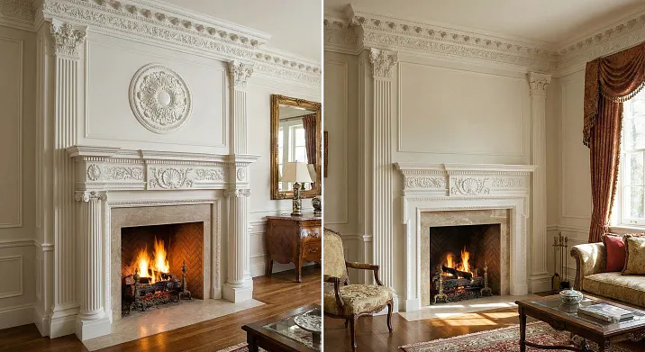 Пилястры — плоский вариант колонн, которые выступают из плоскости портала на 3-5 сантиметров. Они создают вертикальное членение, не занимая много пространства. Для небольших каминов в скромных гостиных пилястры — оптимальный выбор, который даёт архитектурную выразительность без массивности.