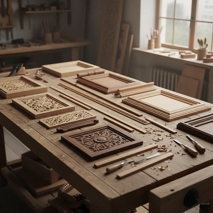 Молдинги — профилированные планки с рельефным сечением, создающие декоративные акценты. Ширина варьируется от 20 до 150 мм, профиль может включать каннелюры, бусины, выкружки, валики. Молдинги деревянные добавляют классическую изысканность.
