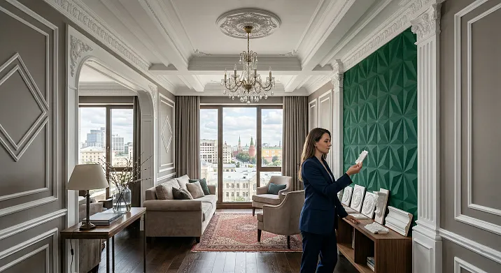 Реновация квартиры в старом фонде. Высокие потолки, длинные коридоры, арочные проёмы — всё это создаёт идеальный контекст для лепного декора. Но гипсовая лепнина здесь была бы слишком тяжёлой и дорогой. Полиуретановые карнизы, молдинги и розетки позволяют воссоздать атмосферу старомосковского интерьера без конструктивного вмешательства.