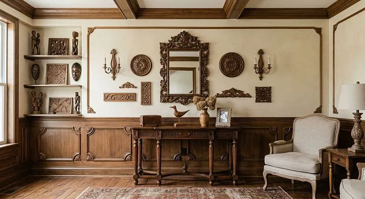 Стена — главное поле для работы с декором. Именно здесь деревянные декоративные элементы для стен раскрываются во всей красоте. Самый распространённый приём — создание рамочных композиций с помощью молдингов и угловых элементов. Стена делится на прямоугольные поля, ограниченные рамками из молдингов. Внутри каждой рамки — краска, обои или декоративная штукатурка. По углам рамок ставятся резные угловые детали, которые придают композиции завершённость.