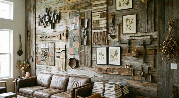 Природные материалы — дерево в натуральном виде (не крашенное, не золочёное), с видимой текстурой. Деревянные рейки — характерный элемент.
