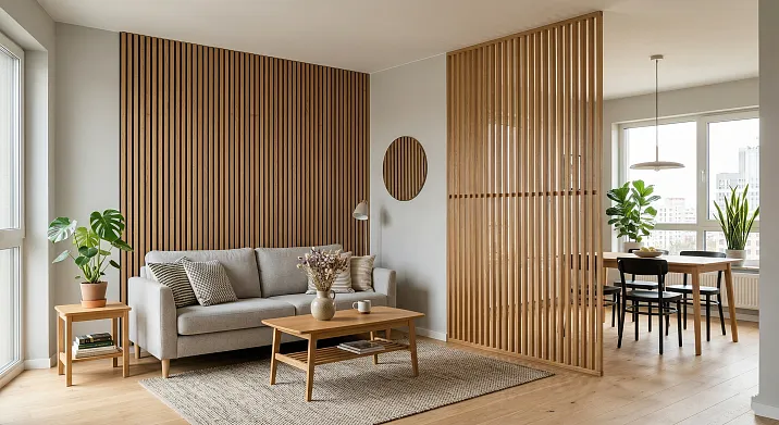 Да. Акцентная стена с реечными панелями визуально «маркирует» зону в открытой планировке. Вертикальная конструкция из реечных панелей как перегородка — полупрозрачная граница между зонами.