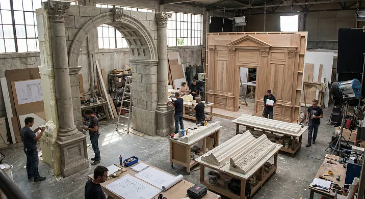 Для фасадных элементов и масштабных архитектурных форм часто используется комбинированный подход: несущий каркас из металла или дерева обшивается легкими панелями, на которые затем монтируются декоративные элементы. Это позволяет создавать декорации для фильма, которые выглядят монументально, но при этом остаются мобильными и относительно легкими в установке.