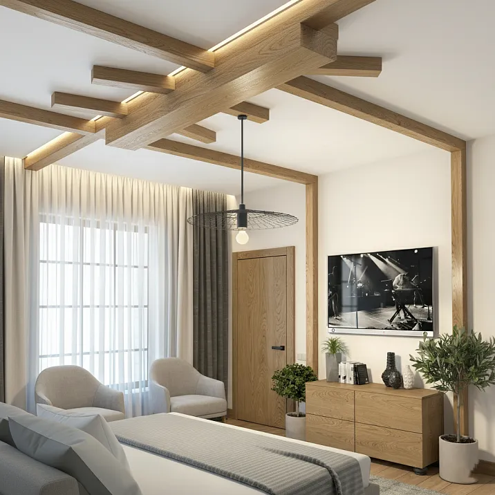Декоративные или фальш-балки — элементы, имитирующие настоящие несущие балки, но не выполняющие конструктивной функции. Они крепятся к готовому потолку или стенам, служат исключительно для визуального эффекта. Это даёт дизайнеру полную свободу — выбирай любое количество, расположение, размер, цвет балок.