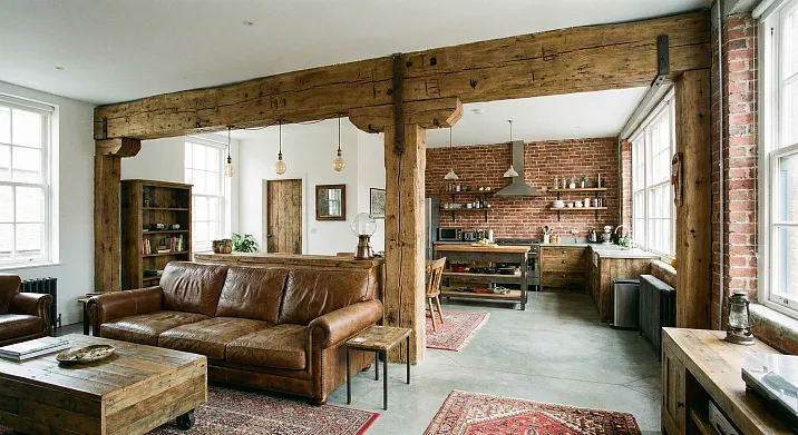 Теперь войдите в квартиру-студию в городе. Стены кирпичные, потолок бетонный, мебель индустриальная. И под потолком — деревянная балка, массивная, брутальная, тёмная. Она проходит над зоной кухни, визуально отделяя её от гостиной, зонируя пространство без физических перегородок, сохраняя открытость и свет. Балка не несёт нагрузки (это декоративный элемент), но она создаёт лофт-стиль, добавляет индустриальность, структурирует пространство.