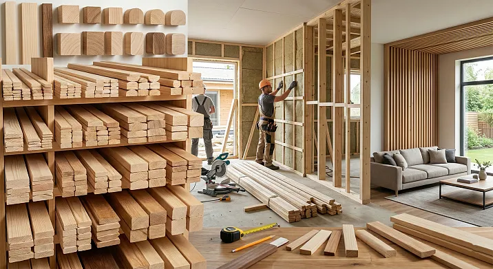 Рейка 30×50 мм или 40×60 мм при шаге 400–600 мм — классический деревянный каркас под ГКЛ. Его преимущества перед металлом: лёгкость монтажа, хорошая адгезия для саморезов, отсутствие «холодовых мостов» в стеновых конструкциях. Недостаток: требует более сухого материала (влажность ≤ 12%) и тщательной антисептирования в помещениях с переменной влажностью.