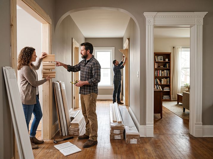 Деревянные наличники — прямые «родственники» стеновых молдингов. В идеале их профили совместимы: один уровень сложности, одна порода, одно покрытие. Наличник шириной 70 мм и стеновой молдинг шириной 30 мм — соразмерная пара. Наличник 120 мм и молдинг 15 мм — диспропорция, которую считывает любой.