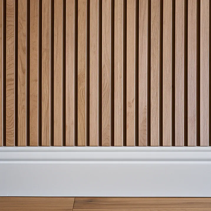 Рейка деревянная строганная с выраженной текстурой годовых колец требует визуально спокойного плинтуса МДФ с ламинированной поверхностью, имитирующей гладкую древесину. Такое сочетание создает баланс между природной выразительностью и лаконичной формой. Молдинги деревянные декоративные могут иметь тонкую резную текстуру, которая перекликается с природным рисунком реек, создавая тематическую связь.