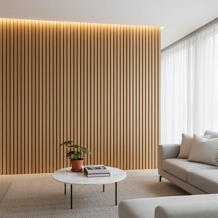 Современное решение — готовые панели, где рейки уже закреплены на подложке (обычно МДФ или фанера). Панель крепится на стену целиком, не нужно монтировать каждую рейку отдельно. Быстро, технологично, идеальный шаг и пропорции.