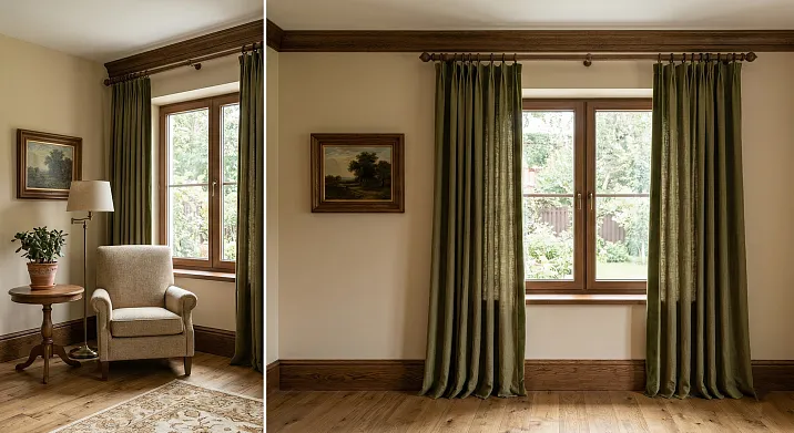 Когда деревянный карниз для штор и плинтус деревянный напольный согласованы — комната дышит единством. Штора падает из правильной точки. Плинтус ведёт взгляд по нижней зоне. Между ними — стена, которая становится фоном, а не случайной поверхностью. Это и есть профессиональный интерьер.
