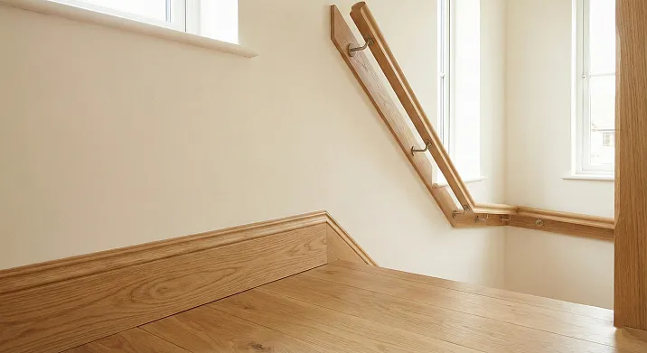 Деревянный плинтус у основания стен и деревянный поручень на лестнице создают визуальную рифму — повторяющийся мотив, который успокаивает глаз, придаёт интерьеру упорядоченность. Когда оба элемента выполнены из одной породы древесины, текстура перекликается: характерные сердцевинные лучи дуба на плинтусе повторяются на поручне, тёплый розоватый оттенок бука внизу находит отражение наверху.