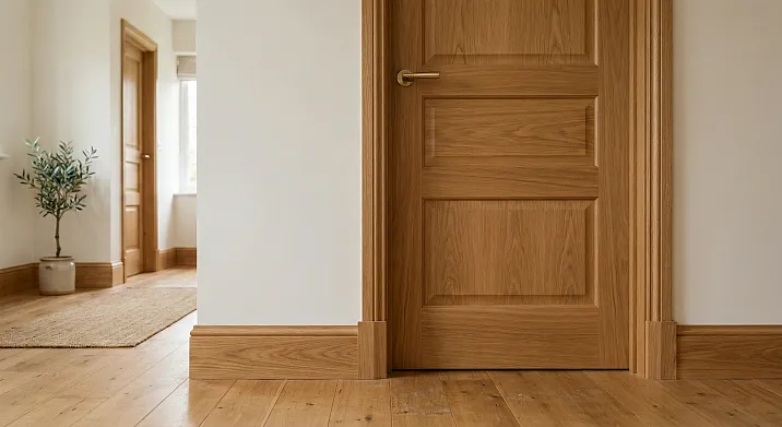 Уровень 2 — Хороший. Единый тон + согласованный масштаб профиля. Плинтус высотой 60 мм + наличник шириной 50–60 мм из той же серии. Оба — из одной породы с одним покрытием.