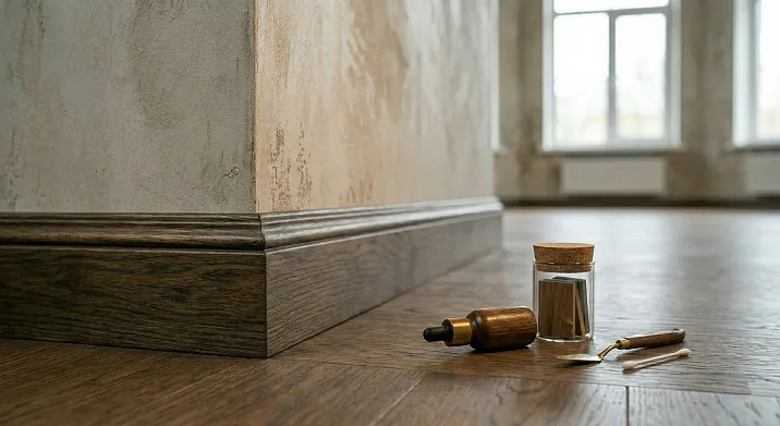 Практическая сложность: добиться точного совпадения тона плинтуса и пола из разных материалов — задача нетривиальная. Паркет из дуба и плинтус из дуба, покрытые одним маслом в одной партии, — совпадут. Паркет из дуба + плинтус из сосны под «дубовую» морилку — уже другая история: разные породы иначе впитывают морилку, тон будет слегка другим. О том, как с этим работать — в разделе о морилке.