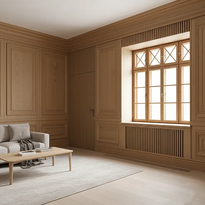 Второй пункт — выбор породы дерева: дуб (премиум, для классики, где важна выразительная текстура), бук (баланс цены и качества, для неоклассики и модерна), сосна (бюджет, только под краску). Порода должна быть одна для всех элементов (плинтусы, наличники, молдинги, рейки, раскладки, мебельный погонаж) — или все элементы окрашены в один цвет непрозрачной краской, скрывающей разницу текстуры. Смешивать породы под прозрачным покрытием нельзя — разница заметна, единство нарушается.
