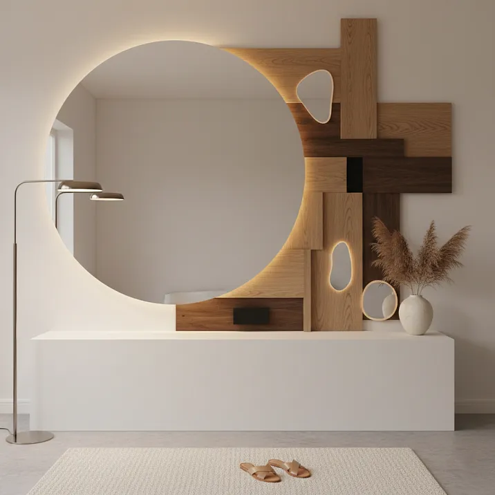 Овальное или круглое зеркало — романтичный, мягкий вариант. Такие формы смягчают геометрию помещения, добавляют женственности, хороши для классических и винтажных интерьеров. Круглое зеркало диаметром семьдесят — девяносто сантиметров прекрасно работает как акцент в спальне или гардеробной.