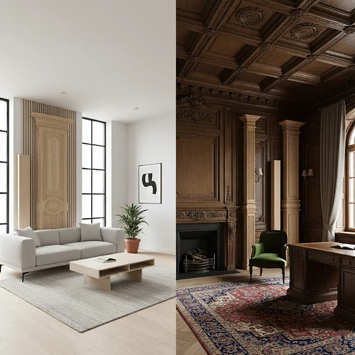 Комбинирование дуба и бука в одном интерьере требует осторожности. Разный цвет (дуб золотисто-коричневый, бук розоватый), разная текстура создают визуальный диссонанс, если элементы стоят рядом. Допустимое комбинирование: дубовый пол и буковые стеновые молдинги (разделены пространственно), дубовые дверные коробки и буковые потолочные карнизы (на разных уровнях). Недопустимое: дубовый плинтус и буковый наличник в одном дверном узле (разнотон очевиден).
