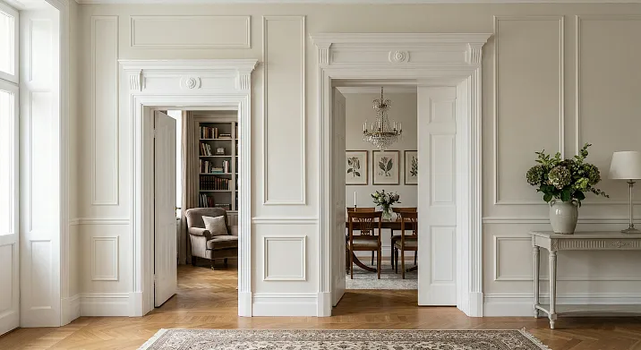 Проём — это граница. Граница между прихожей и гостиной, между спальней и коридором, между частным и общим. То, как она оформлена, определяет, ощущается ли переход между пространствами как архитектурное событие или как строительная необходимость. В неоклассике этот вопрос стоит особенно остро: стиль строится на системе, на ритме и симметрии, и неоформленный проём в неоклассическом интерьере выглядит как пропущенное слово в хорошо выстроенном тексте.