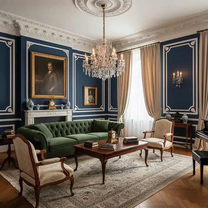 Контрастный вариант — белая лепнина на тёмных стенах (серых, синих, зелёных). Это создаёт более драматичный, графичный эффект. Лепнина становится выразительным элементом, который активно участвует в композиции.