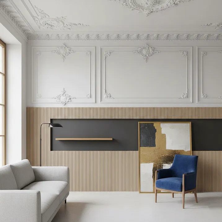 Стыковка реечной стены с классическим потолком — критичный момент. Рейки должны упираться в потолочный карниз, создавая чёткую границу между современной вертикалью и классической горизонталью. Не оставляйте зазора между верхним краем реек и карнизом — это создаст незавершённость. Рейки должны подходить вплотную, создавая ощущение, что карниз служит капителью для современных колонн.