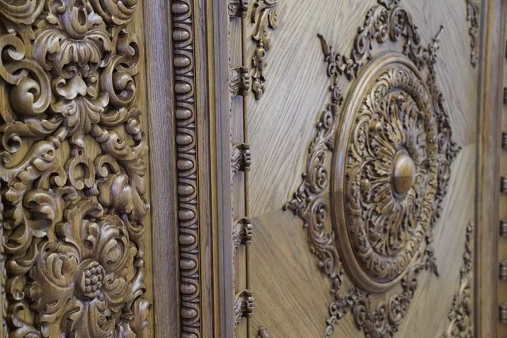 Резные элементы декора создаются комбинированием машинной и ручной обработки. Грубое формообразование выполняется на станках, а финишная детализация — руками мастеров-резчиков. Такой подход обеспечивает идеальную геометрию при сохранении живости ручной работы.