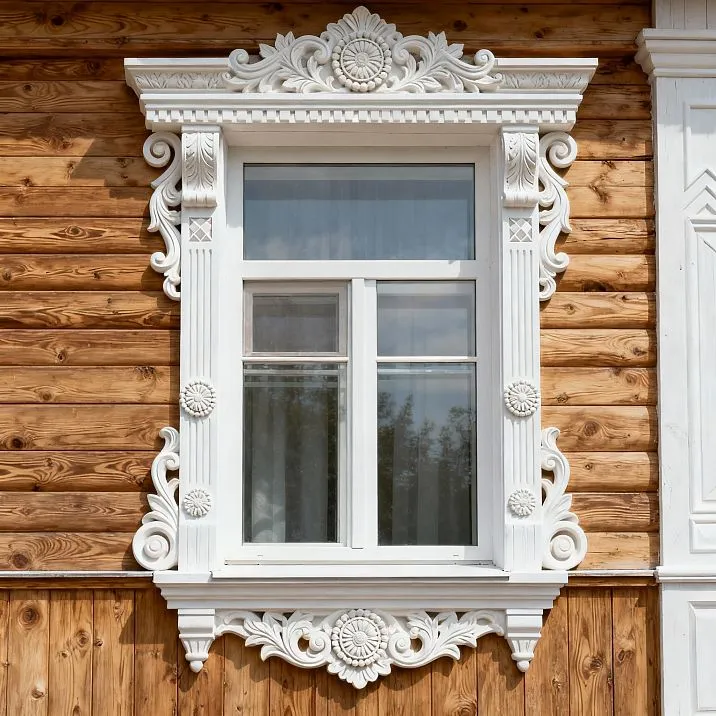 Для семейных домов часто выбирают традиционные решения — деревянные наличники в русском стиле, классические профили, натуральные цвета. Такой декор создаёт ощущение стабильности, связи с традициями.