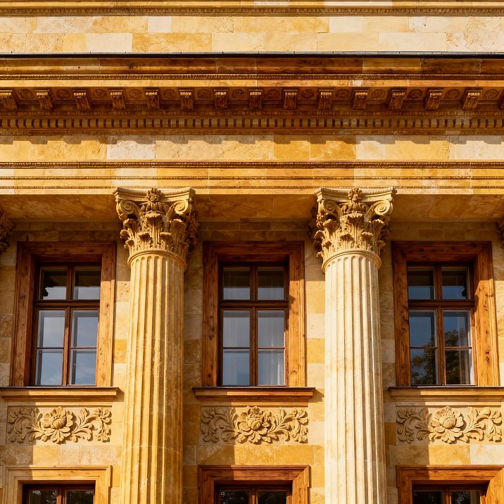 Колонны и пилястры добавляют фасаду вертикальную динамику и торжественность. Современные технологии позволяют воспроизводить все классические ордера - дорический, ионический, коринфский - с точностью до мельчайших деталей. При этом полиуретановые колонны весят в разы меньше каменных аналогов и не требуют мощного фундамента.