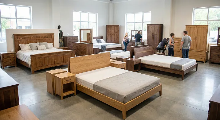Ассортимент кроватей: 20+ моделей от минималистичных платформ до классических с резными изголовьями. Размеры: односпальные 90×200 (25,000-60,000 рублей), полуторные 120×200 (35,000-80,000), двуспальные 160×200 (45,000-100,000), 180×200 (60,000-120,000), кинг-сайз 200×200 (80,000-150,000). Породы — дуб, бук. Отделка — масло натуральное (8 оттенков: натуральный, орех, венге, мореный дуб, выбеленный, красное дерево, палисандр, чёрный), лак полиуретановый матовый/полуматовый. Изголовья — фрезерованные (филёнки, профили), резные (акант, розетки, картуши), мягкие (обивка льном, велюром, бархатом, кожей). Срок изготовления: стандартные модели в наличии (отгрузка 3-5 дней), нестандартные размеры, индивидуальные проекты — 6-12 недель.