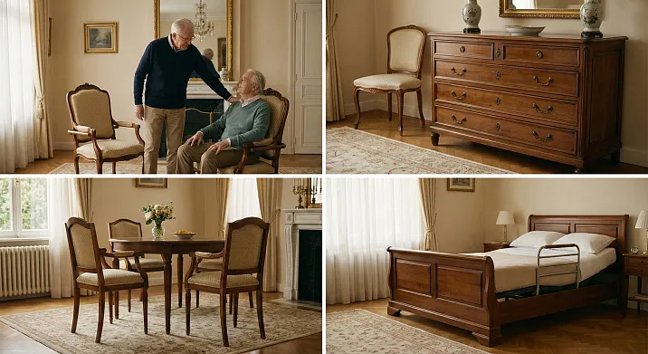 Классическая мебель из массива, адаптированная под потребности пожилых (высота сиденья 460-480 мм, прочные подлокотники, жёсткость сиденья 70-90 N/100 мм, скруглённые углы, устойчивость), функционально эквивалентна медицинской (обеспечивает безопасность, лёгкость вставания, снижает риск падений), но эстетически превосходна. Внешний вид: элегантный, престижный (резные ножки, золочение, обивка велюром, жаккардом, гобеленом, классические стили барокко, ампир, английская классика), ассоциируется с роскошью, культурой, достоинством. Психологический эффект: пожилой человек, сидящий в красивом классическом кресле, воспринимает себя уважаемым, ценным, хозяином дома, сохраняет самоуважение, мотивацию к активности (стараюсь встать сам, потому что могу, кресло помогает, но не заменяет меня).