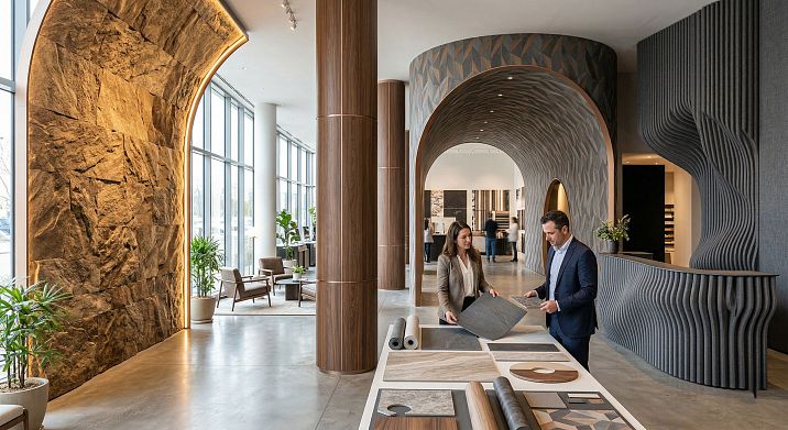 Оформление сложной геометрии. Колонны, арки, ниши, радиусные стены — всё это требует материала, который следует форме, а не противостоит ей. Панели для сложных поверхностей из гибкого формата — единственное решение, которое даёт непрерывность рисунка.