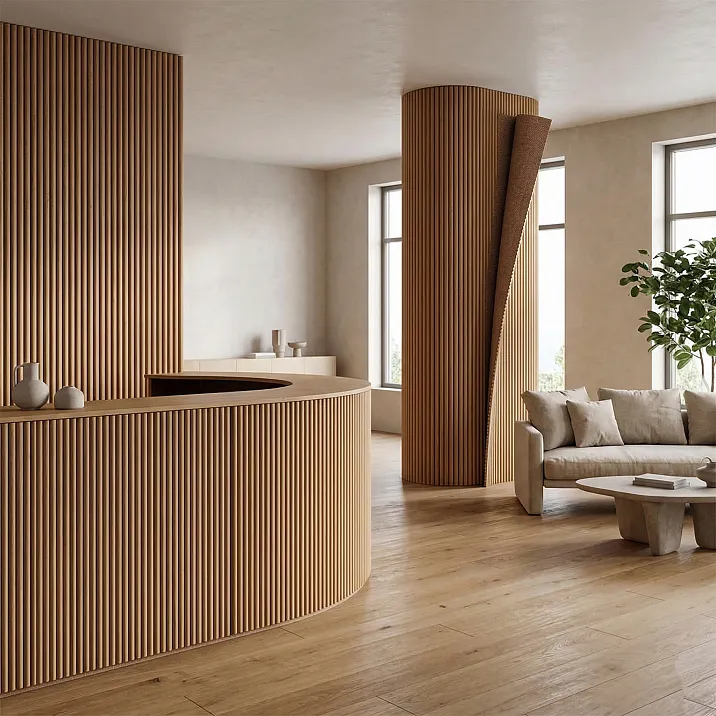Колонна, арка, скруглённый угол, эллиптическая ниша, волнообразная перегородка — все эти формы до недавнего времени были либо недоступны для реечной отделки, либо требовали сложных и дорогостоящих кустарных решений. Гибкая реечная панель изменила эту ситуацию радикально. Сегодня облицовка колонны деревянными рейками занимает несколько часов и не требует специальных инструментов. Арка с реечным покрытием — стандартная задача, решаемая без единого пропила и без потери геометрической точности.