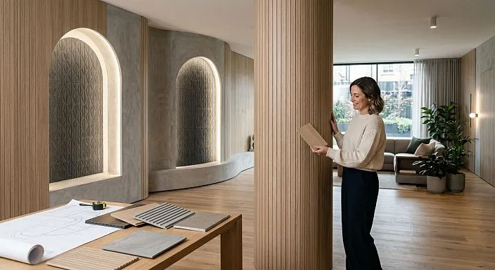 Реечная панель — не изолированный элемент. Она должна рифмоваться с полом, мебелью, текстилем, осветительными приборами. Дубовые рейки с тёплым медовым тоном плохо уживаются с холодным белым глянцем и хромированным металлом — и наоборот.