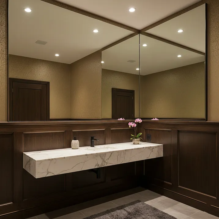 А теперь — ключевой момент. Над декоративной панелью, от её верхнего края до самого потолка, монтируется зеркальная поверхность. Не маленькое зеркало над раковиной, не декоративная вставка, а сплошное полотно высотой сто двадцать — сто пятьдесят сантиметров, занимающее всю стену или её значительную часть.