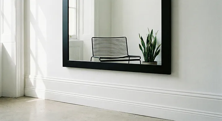 Белая стена — идеальный фон для черного зеркала. Контраст максимален. Черная рама читается как графическое пятно, четкий геометрический объект на чистом белом фоне.