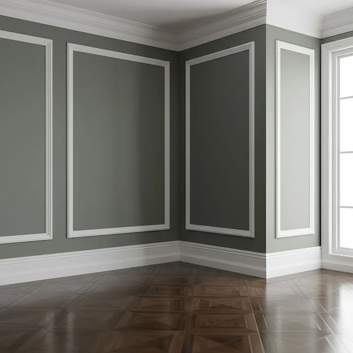 Результат: интерьер обретает архитектурную завершённость. Высокий рельефный плинтус создаёт ощущение респектабельности, соответствующее исторической эпохе здания. Белый цвет контрастирует с тёмным паркетом, подчёркивая границу.