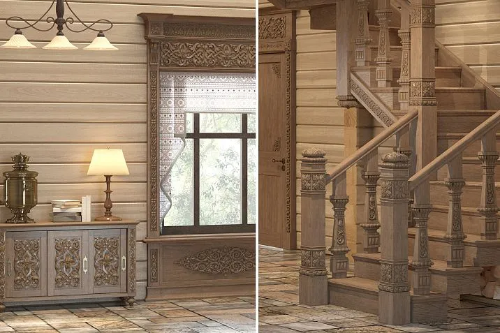 Погонаж в русском стиле помогает создать визуальные связи между различными зонами, подчеркнуть архитектурные особенности пространства, скрыть технические элементы.