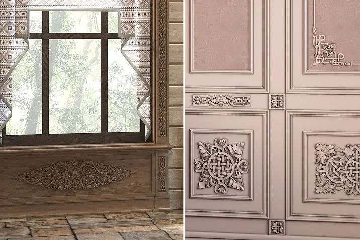 Растительные орнаменты — наиболее популярный тип декора. Виноградная лоза символизирует изобилие, дубовые листья — силу и долголетие, березовые ветки — чистоту и обновление. Декоративные накладки русский стиль с такими мотивами превращают обычную мебель в произведения искусства.