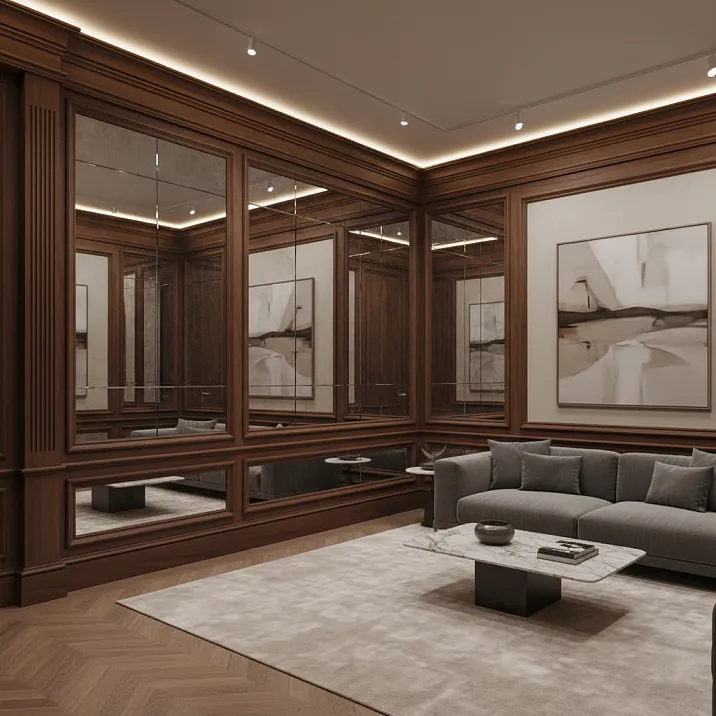 Представьте классический интерьер. Плинтус деревянный высокий из массива дуба, тонированный в цвет ореха, с классическим профилем (выкружка, валики, полочка). Молдинги на стенах из того же дуба, в той же тонировке, с похожим профилем. Рама зеркала снова дуб, снова орех, с резьбой, которая дополняет, а не противоречит рельефу молдингов. Все элементы говорят на одном языке. Они повторяют друг друга, усиливают, создают единое пространство. Это не скучно — это профессионально.