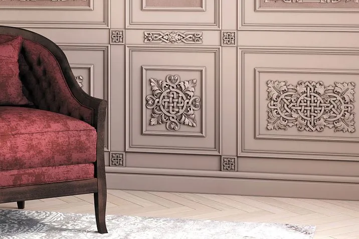 Накладные элементы позволяют превратить обычную мебель в уникальные произведения. Резные накладки на фасадах шкафов, декоративные элементы на спинках стульев, орнаментальные вставки на столешницах — все это создает богатую декоративную среду.