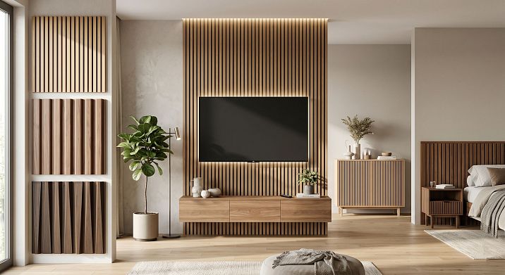 Для ТВ-зоны — рейки 30–50 мм в ширину, тёмного или нейтрального тона, средний шаг. Можно добавить скрытую LED-подсветку снизу. Подробнее о работе с ТВ-зоной — в материале ТВ-зона с рейками.