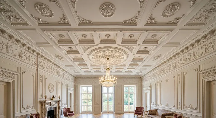 Исторически кессоны вырезались непосредственно в несущих конструкциях — балках и плитах. Сегодня кессонный эффект достигается с помощью молдингов, наклеенных на ровный потолок: визуальный результат практически идентичен, а сложность монтажа несравнимо ниже.