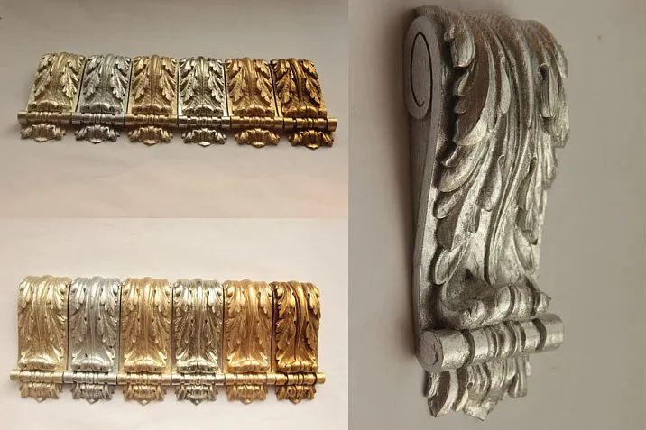 Золочение и серебрение придают мебели роскошный аристократический вид. Современные составы на основе бронзовых порошков позволяют имитировать драгоценные металлы с поразительной достоверностью. Различные оттенки золота, серебра, меди открывают широкие возможности для создания изысканных декоративных эффектов.