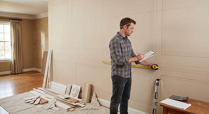 Высота измеряется от уровня чистового пола до потолка. Важный нюанс: если вы планируете установить потолочный карниз и напольный плинтус — вычтите их из общего размера. Рамки молдингов располагаются в рабочей зоне стены: между верхним краем плинтуса и нижним краем карниза.