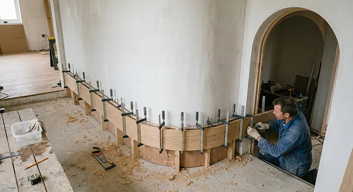 Декоративные колонны в классических интерьерах, конструктивные пилоны в зонированных пространствах, скруглённые «пеналы» в углах — все эти элементы требуют обхвата деревянным плинтусом по окружности. Здесь радиус изгиба, как правило, ещё меньше — от 100 до 300 мм. Это максимально сложные условия для гибки дерева.