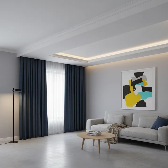 Средние карнизы шириной 8-15 сантиметров - наиболее распространенный вариант для стандартных жилых помещений. Они достаточно выразительны, чтобы создать архитектурный эффект, но не подавляют пространство в комнатах стандартной высоты 2.5-2.7 метра. Средние карнизы позволяют использовать профили умеренной сложности, создавая баланс между функциональностью и декоративностью.