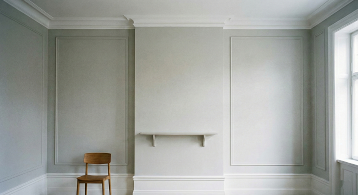 Классический приём — горизонтальный молдинг-бордюр на высоте примерно одной трети от пола (обычно 80–100 сантиметров). Эта линия исторически называлась «стульной панелью» — она защищала стены от повреждений спинками стульев. В современном интерьере функция изменилась, но логика осталась: горизонталь делит стену на два яруса, нижний из которых можно окрасить в более тёмный или контрастный оттенок, оклеить плотными обоями, обшить деревом — а верхний оставить светлым. Это визуально опускает потолок (что хорошо для слишком высоких комнат), создаёт ощущение уюта и камерности, добавляет архитектурную сложность без лишнего декора.